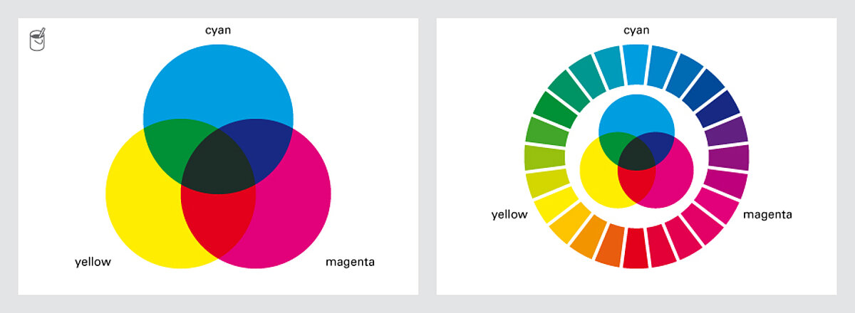 Das CMYK-Farbmodell ist das im Druck übliche subtraktive Vierfarbsystem. CMYK steht für die drei Grundfarben Cyan, Magenta und Gelb (Yellow), sowie die "Schlüsselfarbe" Schwarz (Key). Jede der vier Farben hat einen Wertebereich von 0 % (unbedruckte Fläche) bis 100 % (Volltonfarbe). Die Schlüsselfarbe K wird in der Regel nicht direkt für die Farbgebung eingesetzt, sondern zum Abdunkeln einzelner dunkler Farbbereiche. Ein schwarzer Farbanteil im Zusammendruck kann auch den Kontrast und die Tiefe verstärken. Hinzu kommt, dass sich ein schwarzer Farbton zwar in der Theorie aus Cyan, Magenta und Gelb erzeugen lässt, doch in der Praxis funktioniert dies nicht immer ohne leichte Farbstiche. Das liegt daran, dass die im Druck verwendeten Cyan-, Magenta- und Gelb-Pigmente keine idealen Absorptions- und Remissionseigenschaften haben.