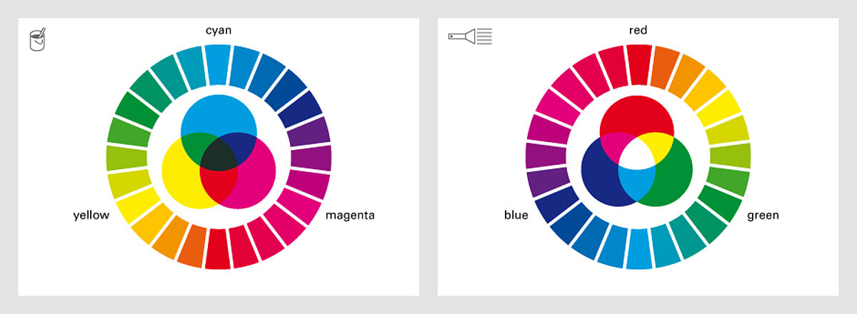 Man unterscheidet zwischen dem additiven (RGB) und subtraktiven Farbsystem (CMYK). Subtraktive Farben entstehen durch die Lichtanteile, die eine Oberfläche absorbiert bzw. reflektiert. Je nach Farbe einer Oberfläche werden unterschiedliche Anteile aus dem Farbspektrum geschluckt und entsprechend nicht zurückgeworfen. Die Extreme bilden schwarze und weiße Oberflächen, die gar kein Licht (Schwarz) bzw. das ganze Farbspektrum (Weiß) zurückwerfen. Alle subtraktiven Farben lassen sich aus Gelb, Magenta und Cyan mischen. Sie sind die Basis des CMYK-Farbmodells, das im Druck verwendet wird. Additive Farben entstehen durch Überlagerung von farbigem Licht. Je nach Zusammensetzung der Farbanteile Rot, Grün und Blau (RGB) können verschiedene Farben erzeugt werden. Projiziert man die drei RGB-Farben in gleichen maximalen Teilen übereinander, ergibt sich Weiß. Alle Geräte, wie Monitore (selbstleuchtend) oder Scanner und Digitalkameras arbeiten mit dem RGB-Modell.