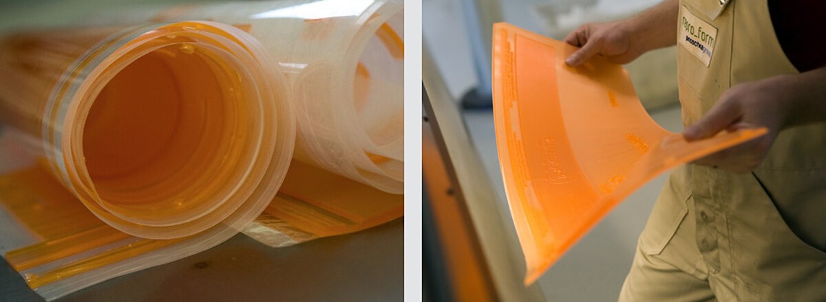 Alle Flexodruckformen bestehen aus flexiblem Material wie Elastomer (Gummi) oder Fotopolymer. Die fotopolymere Druckform wird mittels Laser direkt bebildert und anschließend mit UV-Licht belichtet. Nichtdruckende Elemente werden im folgenden Waschprozess ausgewaschen. Restlösemittel aus dem Waschvorgang verflüchtigen sich während der abschließenden Trocknung der Druckform. Die fertigen Druckplatten (Klischees) werden mit Klebebändern auf einem Grundzylinder montiert. Für das Druckergebnis ist die Kompressibilität der Folien und der Plattenstärke entscheidend, da beide die Farbübertragung beeinflussen. Für den Flächendruck werden deshalb dicke Platten und inkompressible Folien verwendet, während sich für den Rasterdruck dünnere Platten und kompressible Folien besser eignen. Für starke Bedruckstoffe (z.B. Wellpappe) werden Dickplatten verwendet, da diese Variationen in der Stärke des Druckmaterials kompensieren können.