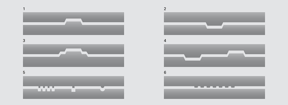 Man unterscheidet zwischen Embossing/ Debossing und Blindprägung. Während beim Embossing und Debossing jeweils ein Set zweier Arten von Zylindern erstellt wird, die genau ineinander passen, gibt es bei der Blindprägung nur einen Prägezylinder, der den Bedruckstoff gegen einen glatten Zylinder prägt. Die Prägung wird hier durch Kompression und nicht durch plastische Verformung erzeugt. Zwei weitere Möglichkeiten zu prägen, sind zum einen die Heißfolienprägung (hot foil stamping), die über erhitzte Elemente eine Effektfolie aufschweißt und zum anderen die Kaltfolienprägung (cold foil stamping) bei der zunächst ein Klebelack auf das Substrat gedruckt wird und dann dem gedruckten Lack folgend eine Effektfolie übertragen wird.