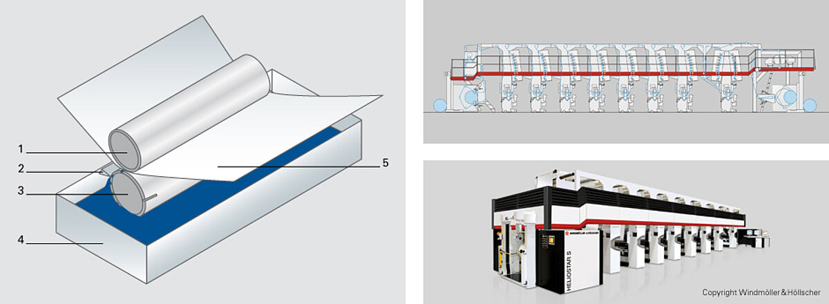 Gravure, also called rotogravure, developed from copperplate engraving. The direct printing process offers the highest printing quality and is used today in art reproduction as well as in the commercial printing sector. Rotogravure is used in particular for high and very high print runs, e.g. of catalogues and magazines. In contrast, sheet-fed gravure is reserved for more expensive and particularly high-quality print products. A gravure cylinder in whose surface the printing design is engraved acts as a printing form. A portion of the printing form dips into a tray with thin liquid printing ink. The ink is removed from the raised, non-printing surfaces with a doctor blade, similar to a steel ruler. Cell walls, which cover the cylinder like a grid shaped net, ensure the clean guidance of the doctor blade even over large surfaces to be printed. After the doctor blade wipe-off, the printing ink remains in the depths, the so-called cells, and is released through mechanical contact with the printing material.? Dark and lighter tones are created through more or less ink, i.e. through deep or less deep cells. Gravure is thus the only printing process where different thick ink layers and thus tonal values can be created inside a printing form. Gravure cylinders? are manufactured on a customised basis and are thus absolutely endless, which among other things explains their preferred use on flexible packaging materials. Printing fluctuations due to wear hardly exist in gravure.