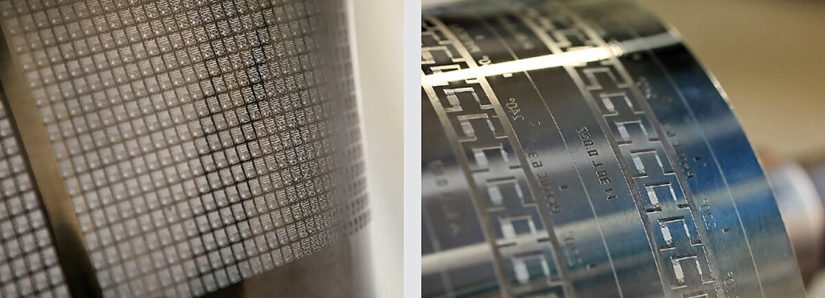 RFID stands for Radio Frequency Identification and is a technology for contactless identification using electromagnetic alternating fields (radio waves). The core of RFID technology is a computer chip, the RFID transponder. This tiny computer chip with an antenna is applied to different objects and contains information. The information is read with a reading device. The required electrical switch elements, e.g. on packaging, can partially be produced using precisely manufactured RFID printing forms in the printing process. The widest variety of use exists for RFID technology; in the packaging area it represents a meaningful supplement to a barcode.