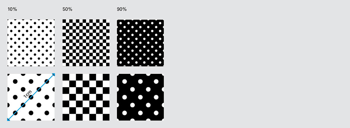 The screen resolution (screen frequency) is the distance of the individual screen dots and is indicated in lines per cm or lines per inch. The screen frequency is the reciprocal value of the screen resolution. If you refer to a 54 screen, 54 screen dots are positioned on a segment of one centimetre. The screen resolution is selected depending on the printing process and the surface structure of the printing substrate. In general, the finer the surface, also the finer the screen resolution.