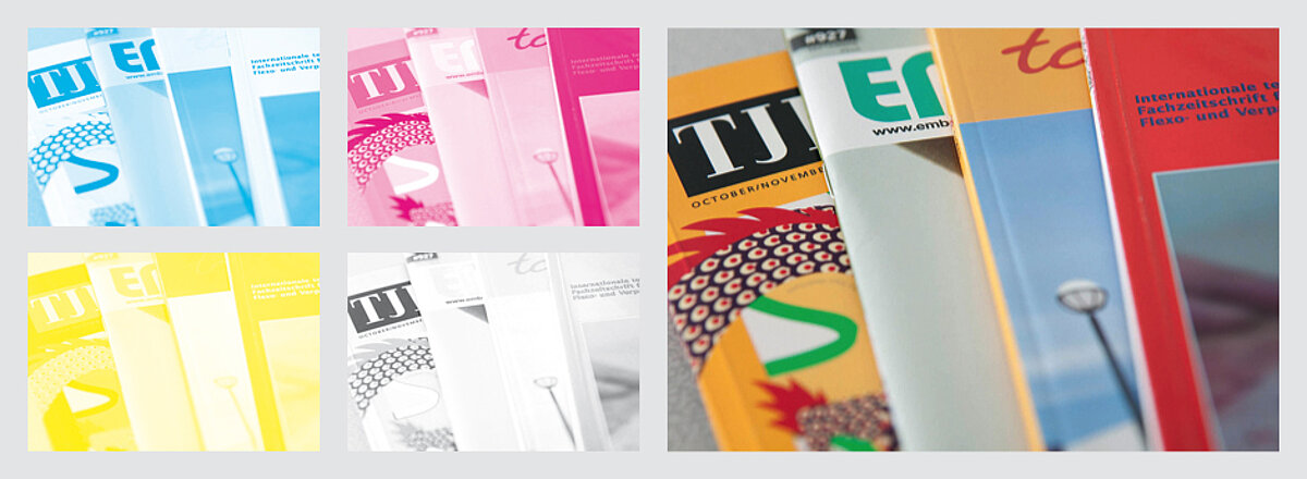 In industrial printing processes, e.g. offset printing, gravure and flexo printing, only one colour can be printed with each printing form in the printing press. To obtain a multicoloured motif, the printing substrate has to be printed several times successively. Printing templates therefore have to be analysed into separate single colour images, so-called colour separations. Usually the print templates are divided into the four colours of the CMYK system for this purpose. Each colour separation only shows the individual parts of a printing colour in the entire image. Furthermore, if special colours are used, further colour separations have to be created. The following always applies: a colour separation exists per printing colour. When printed over each other, all colour separations again have to give the motif of the printing template. Colour separations are produced today on the computer with the help of corresponding software solutions. The analogue use of special colour filters is no longer necessary.